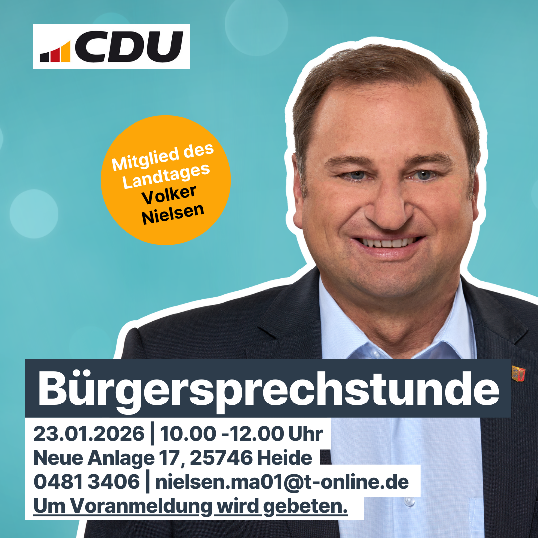 Sie haben Fragen, Anliegen oder Anregungen zur Landespolitik oder zu Themen, die Sie und Ihre Gemeinde bewegen? Dann nutzen Sie die Gelegenheit zum persönlichen Austausch mit unserem Landtagsabgeordneten Volker Nielsen!